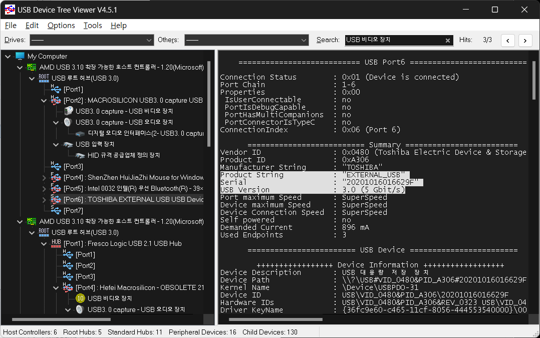 아래 이미지는 USBTreeViewer 로 USB3.0 capture 가 USB 2.1 에 물려 있는 것을 확인할 수 있다