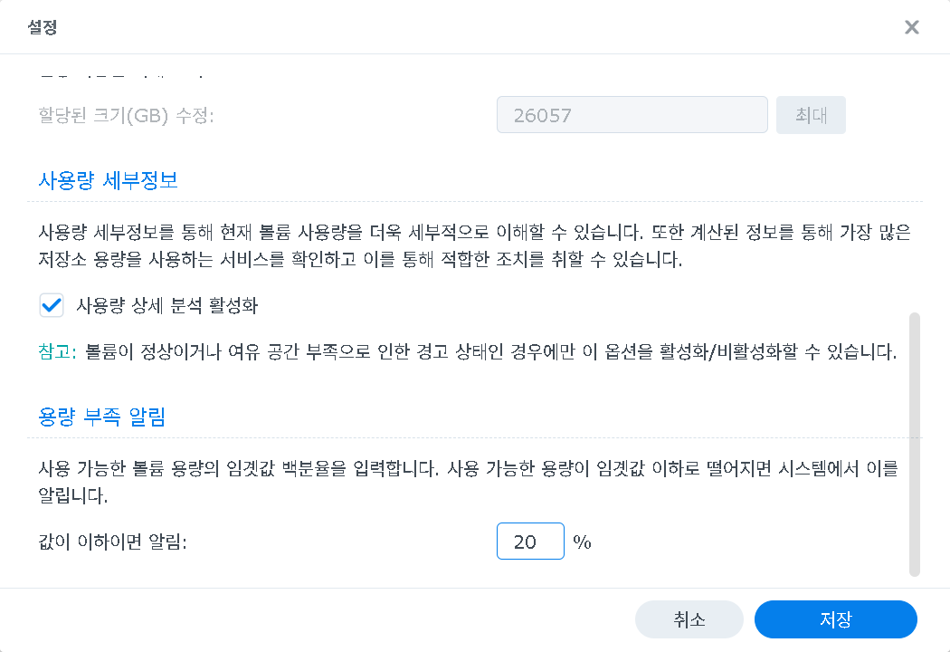 볼륨 설정 대화 상자를 아래로 내려 보면 용량 부족 알림 비율을 설정할 수 있는 입력 항목이 나타난다